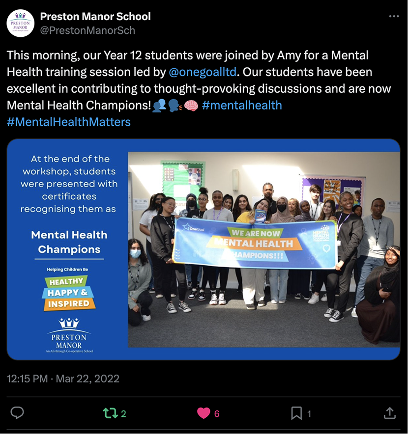 Our pupils that have taken part in the workshop, will now have the knowledge and skills to help their fellow pupils with a range of mental health concerns that their peers may bring to them.